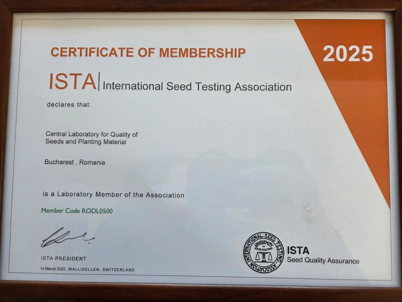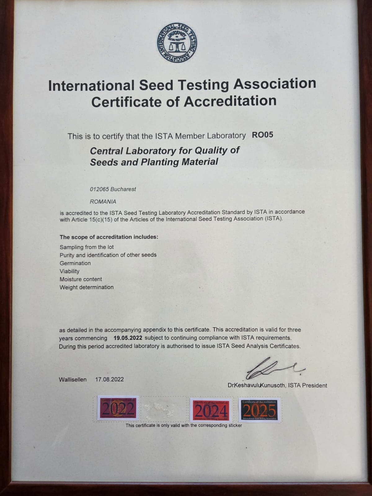- Efectuează analize privind condiţiile de calitate şi stare sanitară la seminţele destinate exportului şi emite documente internaţionale în baza acreditării acordate de Asociaţia Internaţională pentru Testarea Seminţelor, la care România este parte;